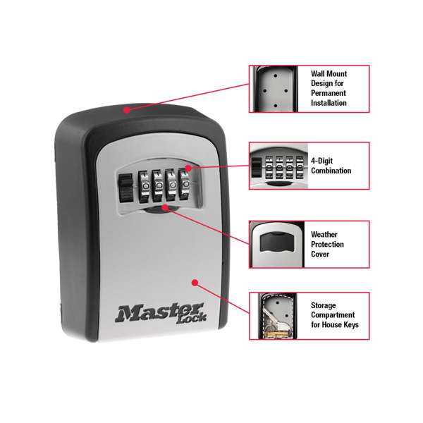 KEYSAFE LOCK BOX WALL MOUNT by Master Lock is recognized around the world as the toughest brand of padlocks and security products. Select Access key safes are the safest places to store and share your spare keys. Set your own combination and choose who has the combination. Ideal for children after school, elderly care providers, tradesmen, and housekeepers. The wall mount design ensures a permanent installation, while the set-your-own 4-digit combination offers keyless convenience. This lock box can hold up to 5 keys in a convenient location, and the cover protects combination dials from weather, dirt, and grime.