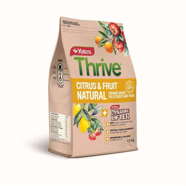 Experience the perfect blend of nature and science with Yates Thrive Natural Citrus & Fruit Organic Based Pelletised Plant Food. This premium product combines organic ingredients with fast-acting fertilisers to ensure your fruiting plants produce richer, juicier, and more abundant fruit. The pelletised form makes it easy to use, and it is mixed with Yates Dynamic Lifter to provide natural trace elements essential for plant health and vitality.
