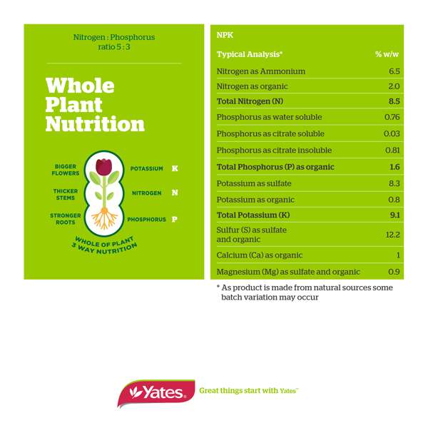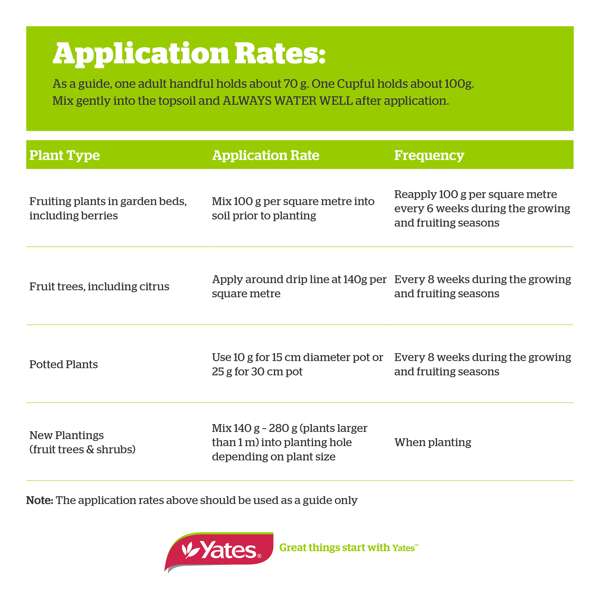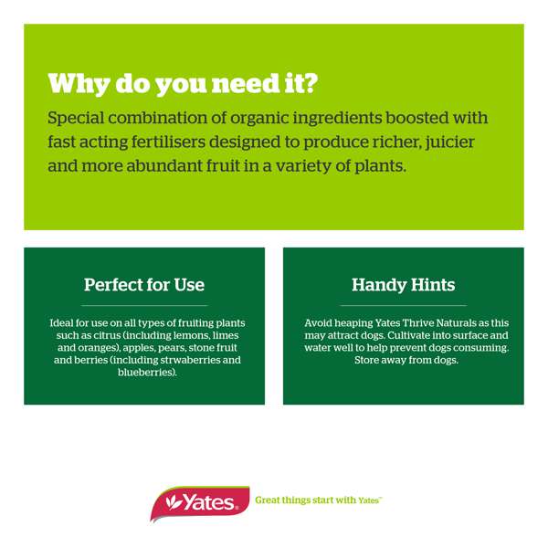 Ideal for a wide range of fruiting plants, including citrus (lemons, limes, oranges), apples, pears, stone fruit, and berries (strawberries, blueberries), Yates Thrive Natural Citrus & Fruit offers a nutrient boost with extra potassium to enhance fruit production. This product is designed to support the overall health and growth of your plants, ensuring they thrive and yield the best possible harvest.